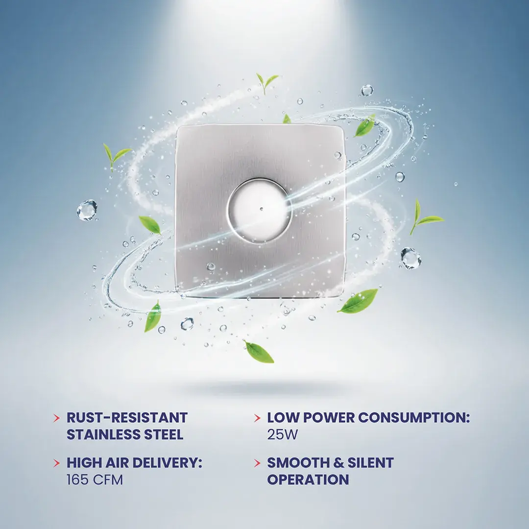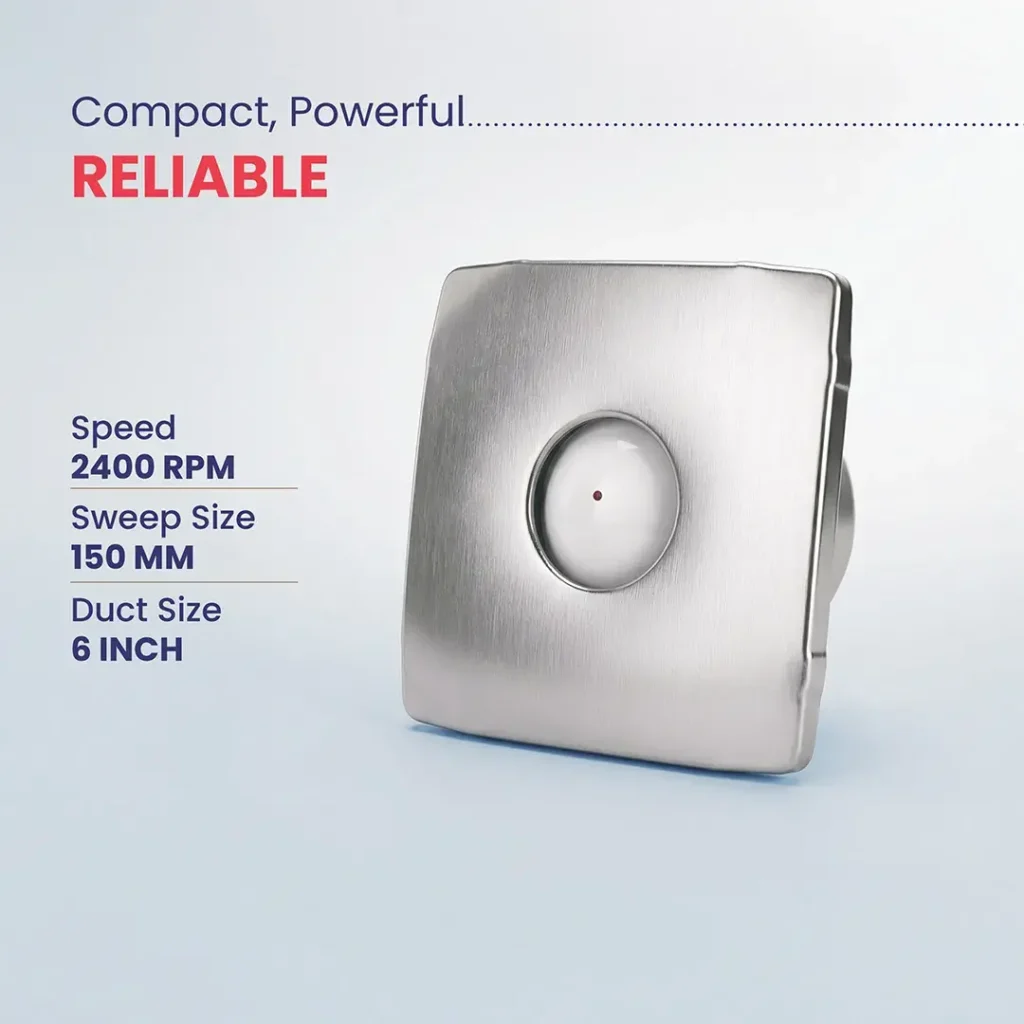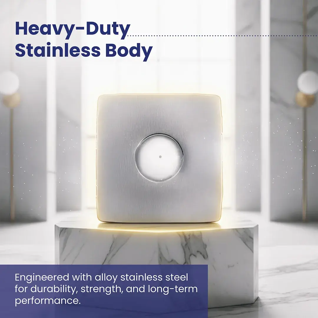 The Indo Alloy 6” Stainless Steel Axial Fan is designed for spaces that demand both strength and a premium finish. Its stainless steel front adds durability while giving the fan a refined, modern look ideal for high-visibility areas.